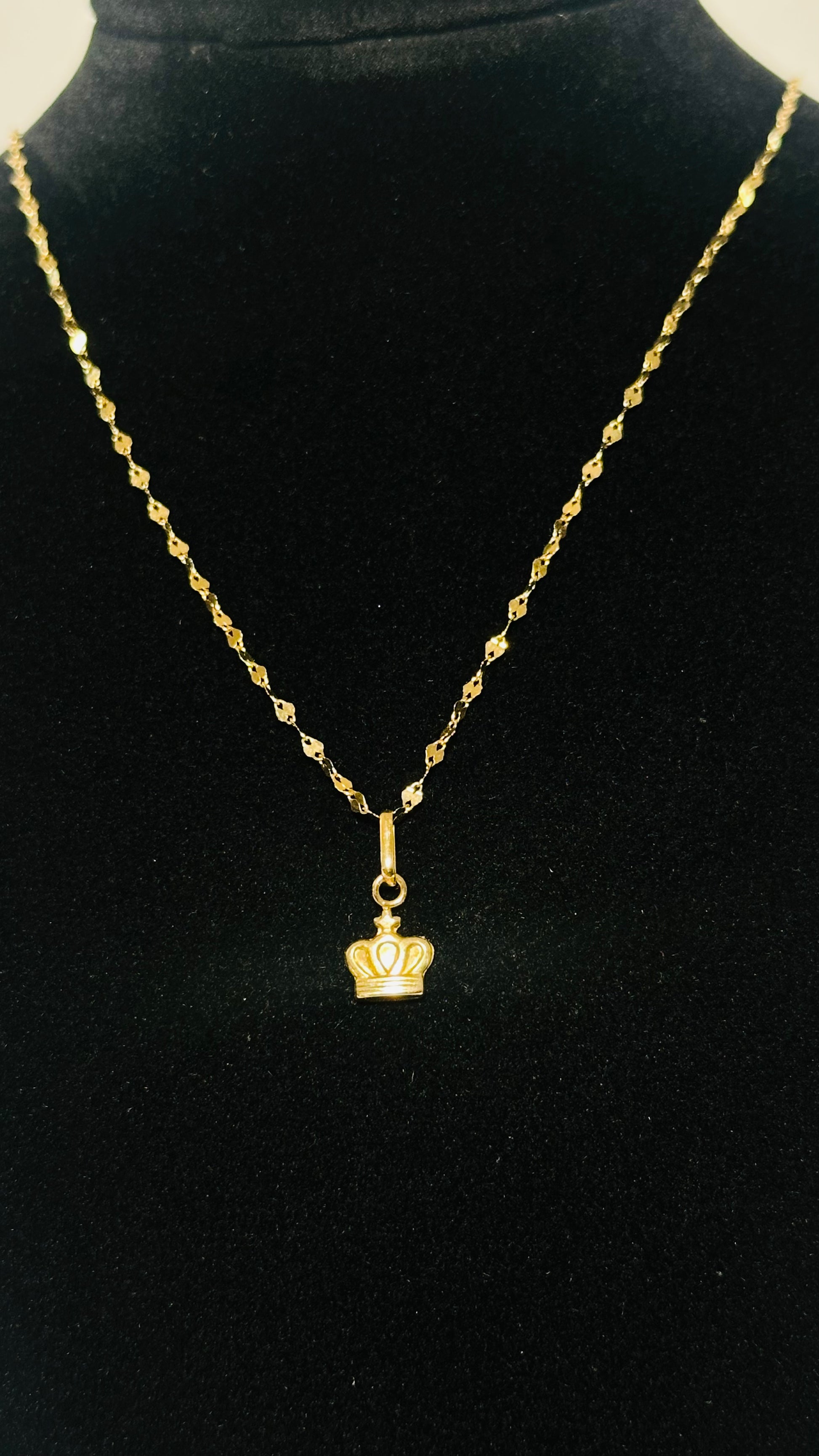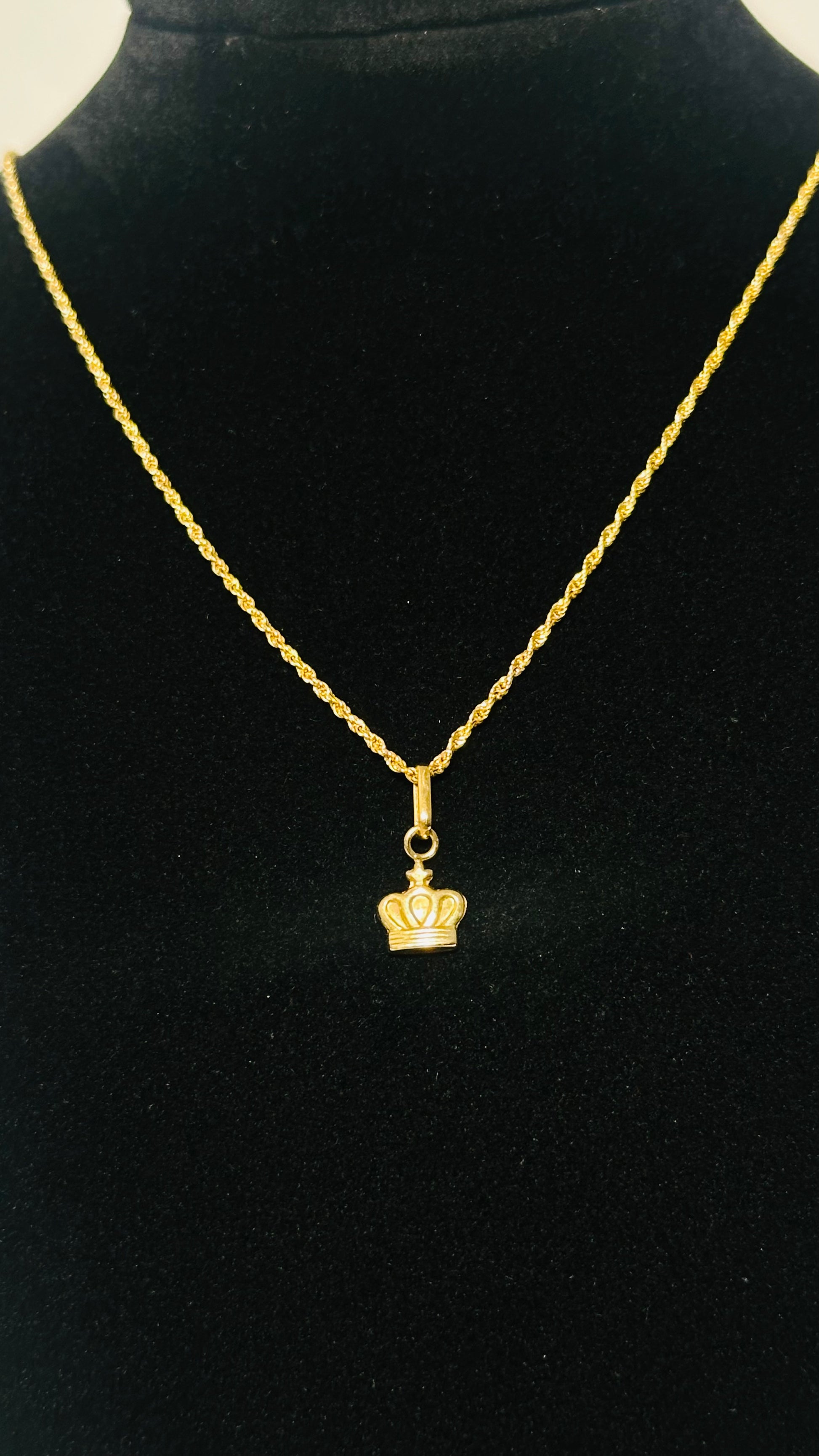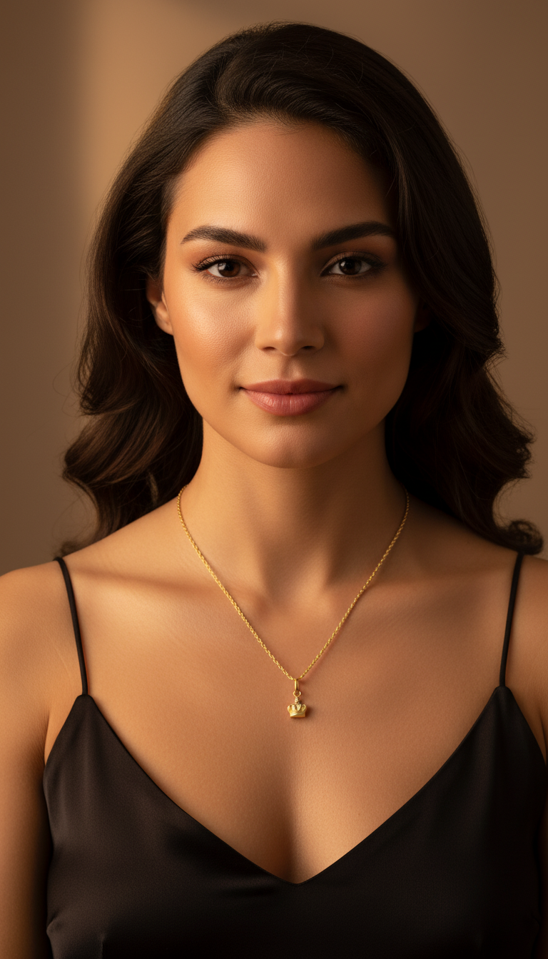 La Corona Royale es un collar de oro de 18 quilates con un dije en forma de corona, diseñado para quienes buscan elegancia, distinción y estilo atemporal.