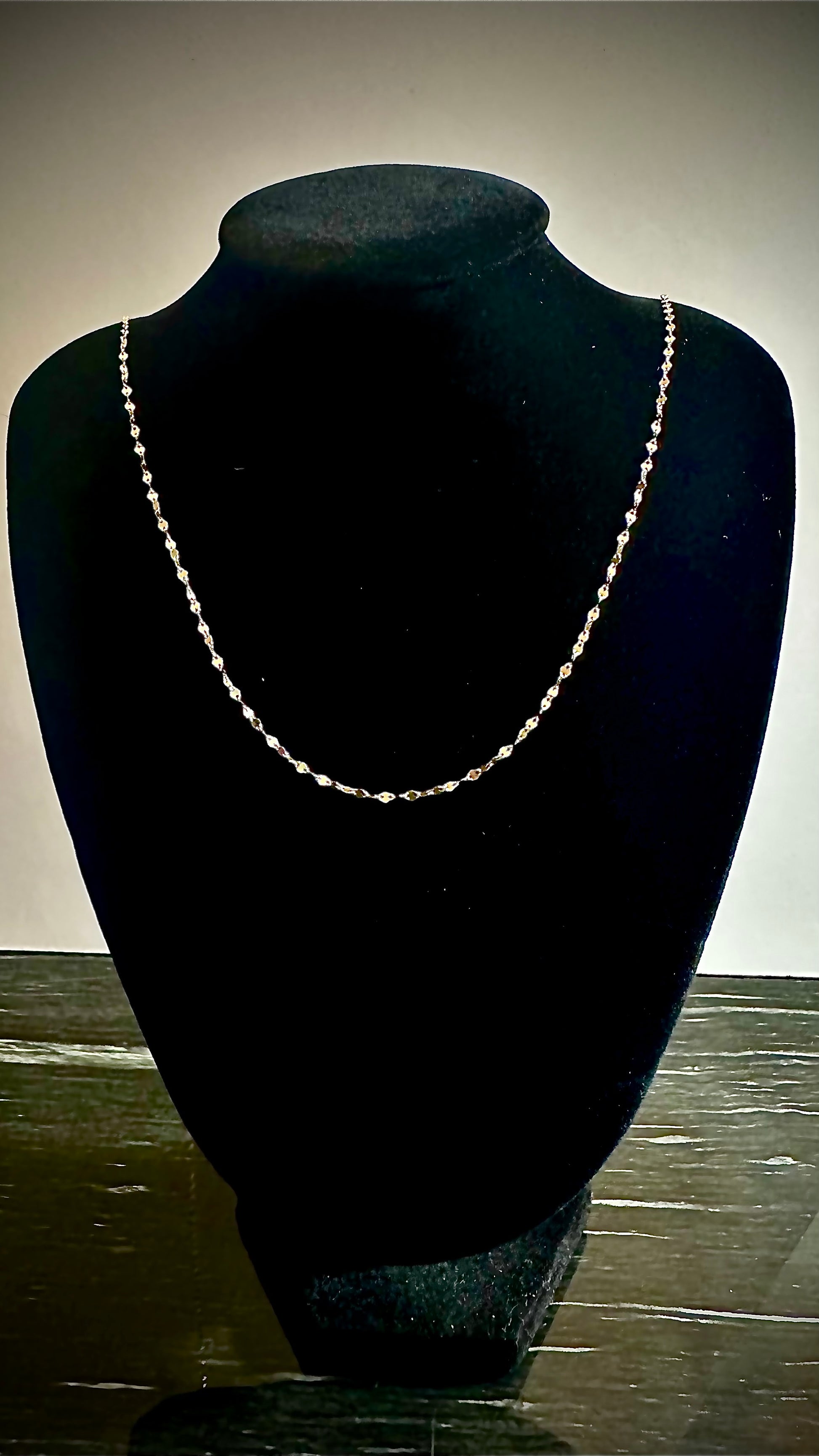 La Crispeta Royal es una cadena para dama en oro 18 quilates, con un peso total de 0.89 gramos, diseñada para quienes buscan elegancia, brillo y sofisticación en cada detalle. Su diseño tipo crispeta aporta textura y delicadeza, haciendo que cada movimiento refleje la luz de manera única.